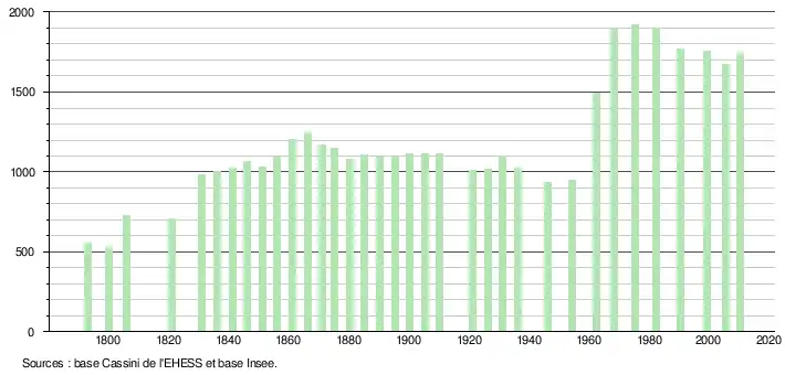L'évolution du nombre d'habitants est connue à travers les recensements de la population effectués dans la commune depuis 1793. À partir du , les populations légales des communes sont publiées annuellement dans le cadre d'un recensement qui repose désormais sur une collecte d'information annuelle, concernant successivement tous les territoires communaux au cours d'une période de cinq ans. Pour les communes de moins de 10 000 habitants, une enquête de recensement portant sur toute la population est réalisée tous les cinq ans, les populations légales des années intermédiaires étant quant à elles estimées par interpolation ou extrapolation[4]. Pour la commune, le premier recensement exhaustif entrant dans le cadre du nouveau dispositif a été réalisé en 2005[5],[Note 1].