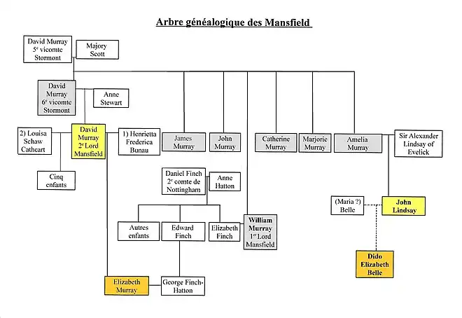 - On lui présente Dido comme la fille d'une prisonnière enceinte trouvée par John Linsay dans un navire espagnol et ramenée par ses soins en Angleterre où « elle accoucha de cette fille, dont Lord Mansfield a pris soin et qui a été éduquée par sa famille » (Sir Jno. Lindsay, having taken her mother prisoner in a Spanish vessel, brought her to England, where she was delivered of this girl, of which she was then with child, and which was taken care of by Lord M. and has been educated by his family[5]).