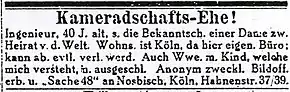 Une annonce de contact typique pour un faux mariage hétérosexuel dans Die Freundschaft (janvier 1920).