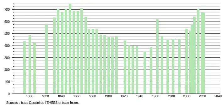 L'évolution du nombre d'habitants est connue à travers les recensements de la population effectués dans la commune depuis 1793. Pour les communes de moins de 10 000 habitants, une enquête de recensement portant sur toute la population est réalisée tous les cinq ans, les populations légales des années intermédiaires étant quant à elles estimées par interpolation ou extrapolation[19]. Pour la commune, le premier recensement exhaustif entrant dans le cadre du nouveau dispositif a été réalisé en 2004[20].