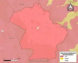 Les mouvements de terrains susceptibles de se produire sur la commune sont des affaissements et effondrements liés aux cavités souterraines (hors mines) et des tassements différentiels[21]. Afin de mieux appréhender le risque d’affaissement de terrain, un inventaire national permet de localiser les éventuelles cavités souterraines sur la commune[22]. Le retrait-gonflement des sols argileux est susceptible d'engendrer des dommages importants aux bâtiments en cas d’alternance de périodes de sécheresse et de pluie[23]. 99,9 % de la superficie communale est en aléa moyen ou fort (79,5 % au niveau départemental et 48,5 % au niveau national)[Carte 2]. Depuis le , en application de la loi ÉLAN, différentes contraintes s'imposent aux vendeurs, maîtres d'ouvrages ou constructeurs de biens situés dans une zone classée en aléa moyen ou fort[Note 4],[24].