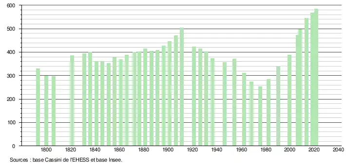 L'évolution du nombre d'habitants est connue à travers les recensements de la population effectués dans la commune depuis 1793. Pour les communes de moins de 10 000 habitants, une enquête de recensement portant sur toute la population est réalisée tous les cinq ans, les populations légales des années intermédiaires étant quant à elles estimées par interpolation ou extrapolation[30]. Pour la commune, le premier recensement exhaustif entrant dans le cadre du nouveau dispositif a été réalisé en 2008[31].
