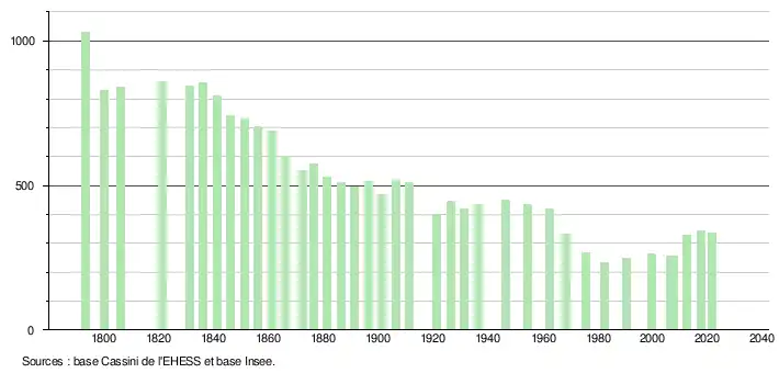 L'évolution du nombre d'habitants est connue à travers les recensements de la population effectués dans la commune depuis 1793. Pour les communes de moins de 10 000 habitants, une enquête de recensement portant sur toute la population est réalisée tous les cinq ans, les populations légales des années intermédiaires étant quant à elles estimées par interpolation ou extrapolation[26]. Pour la commune, le premier recensement exhaustif entrant dans le cadre du nouveau dispositif a été réalisé en 2007[27].