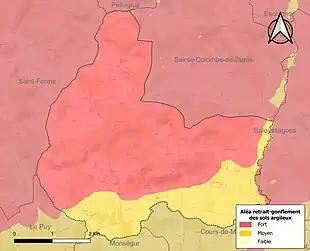 Le retrait-gonflement des sols argileux est susceptible d'engendrer des dommages importants aux bâtiments en cas d’alternance de périodes de sécheresse et de pluie. La totalité de la commune est en aléa moyen ou fort (67,4 % au niveau départemental et 48,5 % au niveau national). Sur les 151 bâtiments dénombrés sur la commune en 2019, 151 sont en aléa moyen ou fort, soit 100 %, à comparer aux 84 % au niveau départemental et 54 % au niveau national. Une cartographie de l'exposition du territoire national au retrait gonflement des sols argileux est disponible sur le site du BRGM[18],[Carte 2].