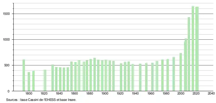 L'évolution du nombre d'habitants est connue à travers les recensements de la population effectués dans la commune depuis 1793. Pour les communes de moins de 10 000 habitants, une enquête de recensement portant sur toute la population est réalisée tous les cinq ans, les populations légales des années intermédiaires étant quant à elles estimées par interpolation ou extrapolation[34]. Pour la commune, le premier recensement exhaustif entrant dans le cadre du nouveau dispositif a été réalisé en 2005[35].