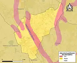 Le retrait-gonflement des sols argileux est susceptible d'engendrer des dommages importants aux bâtiments en cas d’alternance de périodes de sécheresse et de pluie. La totalité de la commune est en aléa moyen ou fort (92 % au niveau départemental et 48,5 % au niveau national). Sur les 621 bâtiments dénombrés sur la commune en 2019, 621 sont en aléa moyen ou fort, soit 100 %, à comparer aux 96 % au niveau départemental et 54 % au niveau national. Une cartographie de l'exposition du territoire national au retrait gonflement des sols argileux est disponible sur le site du BRGM[25],[Carte 3].