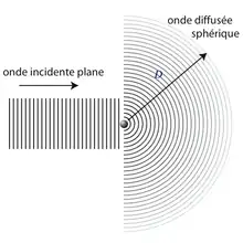Lors d'une expérience de diffusion de rayonnement, une onde plane incidente de vecteur d'onde , (par exemple un faisceau monochromatique de lumière, de rayons X ou de neutrons) éclaire un échantillon. En rencontrant un atome, une partie de cette onde diffuse dans toutes les directions : l'onde diffusée, , est une onde sphérique et son amplitude varie comme l'inverse de la distance au centre diffuseur. L'amplitude de l'onde diffusée s'écrit donc :