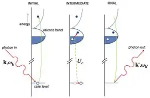 Le RIXS peut être considéré comme un processus en deux étapes. À partir de l'état initial, l'absorption d'un photon incident crée un état excité intermédiaire qui se caractérise par un trou de cœur. À partir de cet état, l'émission d'un photon fait passer dans l'état final. Pour simplifier, le processus d'absorption permet d'obtenir des informations sur les états électroniques non occupés, tandis que l'émission donne des informations sur les états occupés. Dans les expériences RIXS, ces deux informations se combinent, fortement perturbées par le potentiel de trou de cœur dans l'état intermédiaire.