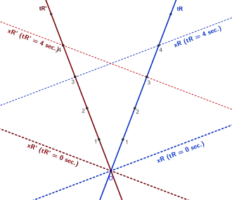 Cette situation peut être représentée par un diagramme de Minkowski symétrique (voir ci-contre). Chaque observateur (, et ) a synchronisé sa montre avec l'autre au point , et les deux observateurs s'éloignent ensuite l'un de l'autre à vitesse constante. Chaque observateur est immobile dans son propre référentiel et décrit une ligne d'univers droite dans l'espace de Minkowski ( et ). Supposons que chaque observateur a déclenché en un même processus physique censé durer quatre secondes. Chaque observateur constate, à sa propre horloge, que le phénomène a en effet duré quatre secondes. Ceci est la conséquence du principe de relativité : tout phénomène physique se déroule exactement de la même manière dans tout référentiel galiléen. Une seconde mesurée par dans le référentiel de est exactement égale à une seconde mesurée par dans le référentiel de [9],[note 1].
