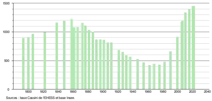 L'évolution du nombre d'habitants est connue à travers les recensements de la population effectués dans la commune depuis 1793. Pour les communes de moins de 10 000 habitants, une enquête de recensement portant sur toute la population est réalisée tous les cinq ans, les populations légales des années intermédiaires étant quant à elles estimées par interpolation ou extrapolation[24]. Pour la commune, le premier recensement exhaustif entrant dans le cadre du nouveau dispositif a été réalisé en 2005[25].