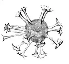 La première personne à reconnaitre les dinoflagellés fossiles fut Christian Gottfried Ehrenberg, qui a rapporté sa découverte dans un article présenté à l'Académie des sciences de Berlin en . Il avait observé des dinoflagellés clairement tabulés dans de minces flocons de silex du Crétacé et considérait ces dinoflagellés comme ayant été silicifiés. Avec eux, se trouvaient des corps sphéroïdaux à ovoïdes de taille comparable et portant un ensemble de protubérances ou de tubes de formes diverses. Ehrenberg les a interprétés comme étant à l'origine siliceux et y a vu des Desmidiées (des algues d'eau douce) et les a placés dans le genre Xanthidium (en) qu'il venait de créer. Bien que des résumés les travaux d'Ehrenberg aient paru plus tôt, les études n'ont été publiés dans leur intégralité que vers 1837 ou 1838[2].