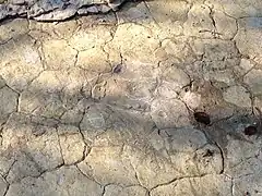 Les empreintes de théropode se résument à une piste de 38 m de long comportant 18 pas dont certaines empreintes ont été recouvertes par des empreintes de pas de sauropodes. Contrairement aux empreintes à sauropodes, celles de théropodes sont mieux préservées en raison d'un substrat humide mais non saturé en eau et principalement composé de tapis algaires qui sèchent rapidement. Elles atteignent 30 cm de longueur et l'espacement des empreintes suggère une vitesse de 13 km/h. Elles appartiendraient à l'ichnogenre Megalosauripus.