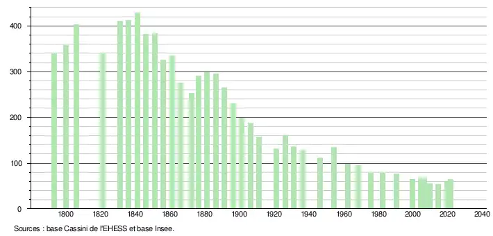 L'évolution du nombre d'habitants est connue à travers les recensements de la population effectués dans la commune depuis 1793. Pour les communes de moins de 10 000 habitants, une enquête de recensement portant sur toute la population est réalisée tous les cinq ans, les populations légales des années intermédiaires étant quant à elles estimées par interpolation ou extrapolation[14]. Pour la commune, le premier recensement exhaustif entrant dans le cadre du nouveau dispositif a été réalisé en 2004[15].