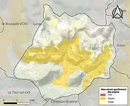 Le retrait-gonflement des sols argileux est susceptible d'engendrer des dommages importants aux bâtiments en cas d’alternance de périodes de sécheresse et de pluie. 31,5 % de la superficie communale est en aléa moyen ou fort (59,3 % au niveau départemental et 48,5 % au niveau national). Sur les 149 bâtiments dénombrés sur la commune en 2019, 147 sont en aléa moyen ou fort, soit 99 %, à comparer aux 85 % au niveau départemental et 54 % au niveau national. Une cartographie de l'exposition du territoire national au retrait gonflement des sols argileux est disponible sur le site du BRGM[20],[Carte 2].