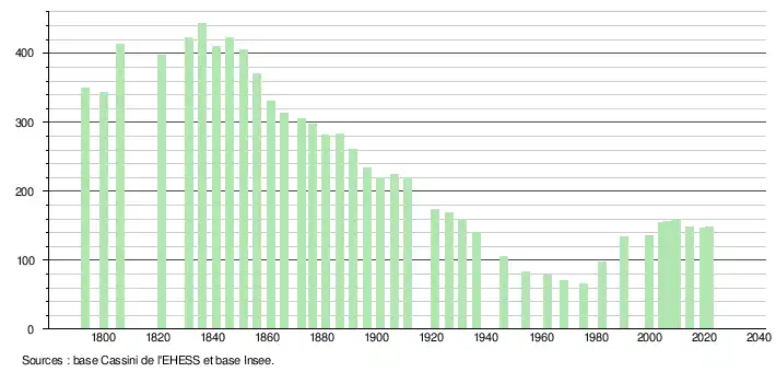 L'évolution du nombre d'habitants est connue à travers les recensements de la population effectués dans la commune depuis 1793. Pour les communes de moins de 10 000 habitants, une enquête de recensement portant sur toute la population est réalisée tous les cinq ans, les populations légales des années intermédiaires étant quant à elles estimées par interpolation ou extrapolation[23]. Pour la commune, le premier recensement exhaustif entrant dans le cadre du nouveau dispositif a été réalisé en 2004[24].