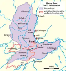 L'élection contestée d'un nouvel évêque en 1436 est négociée durant le concile de Bâle qui s'est ouvert en 1431. En 1527, l'évêque doit abandonner Bâle pour aller résider au Château de Porrentruy. Le chapitre de la cathédrale reste en revanche en ville jusqu'en 1529.