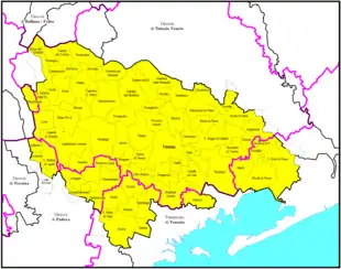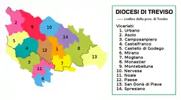 Ne couvrant qu'une partie de la province de Trévise, le diocèse empiète aussi sur les provinces voisines de Padoue, Vicence avec Mussolente et Venise.