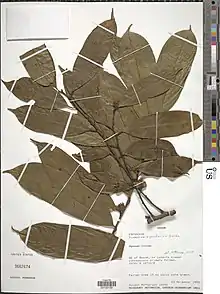 Les feuilles sont gris vert ou brun gris sur la face supérieure et plus foncées sur la face inférieure, de forme elliptique oblongue ou oblongue oblanceolée, mesurant entre 15 et 26 cm de long sur 6 à 10 cm de large. Elles sont caudées acuminées à l’apex, rondes à cunéiformes à la base. Les pétioles mesurent de 0,5 à 1 cm de long.