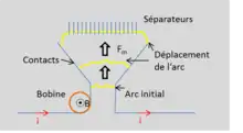 En détails, l'arc apparaît entre deux contacts proches l'un de l'autre. Un dispositif - bobine, aimant permanent - crée un champ magnétique, qui lui-même crée une force de Laplace qui fait se déplacer les pieds de l'arc sur le contact qui est conçu de sorte à favoriser un allongement de l’arc plus rapide et plus grand que celui provoqué par la seule ouverture mécanique des contacts[22]. Il faut noter que si le courant est assez élevé l'usage d'une bobine n'est pas nécessaire. Si au contraire le courant est faible, la mise en place d'un noyau magnétique au centre de la bobine peut être envisagée. Dans tous les cas si le champ produit est trop faible, l'arc ne se déplace pas et n'est pas interrompu. La bobine ne doit dans tous les cas être alimentée que lors de l'ouverture du disjoncteur. Au bout d'un moment, l'arc rencontre les séparateurs. Ceux-ci vont le diviser en de nombreux arcs en série. Les séparateurs peuvent être en matière conductrice ou isolante, dans les deux cas ils servent à refroidir l'arc. Dans le premier cas on parle de cathode froide pour les séparateurs[19],[20].