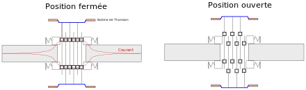 Le sectionneur rapide utilisé dans le montage précédent est d'un design innovant. Il utilise de nombreux contacts en série, chacun monté sur une barre. La moitié des barres sont reliées en haut du mécanisme, l'autre moitié en bas. Quand le sectionneur s'ouvre, les barres sont déplacés, les contacts ne sont plus alignés et le courant est interrompu. La légèreté de chaque ensemble barre avec contact permet d'obtenir une ouverture rapide du mécanisme. Le déplacement est lui-même actionné par deux bobines de Thomson. Le tout étant plongé dans du SF6, ce qui réduit les distances d'isolement[27].