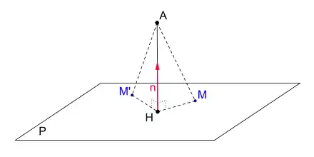 Dans l'espace euclidien, la distance d'un point à un plan est la plus courte distance séparant ce point et un point du plan. Le théorème de Pythagore permet d'affirmer que la distance du point A au plan (P) correspond à la distance séparant A de son projeté orthogonal H sur le plan (P).