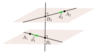 Comme et sont gauches, elles admettent une unique perpendiculaire commune , qui coupe en et en . La longueur est également la distance [1]. Pour trouver ces points il faut combiner les propriétés suivantes :