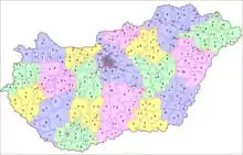 Carte de Hongrie représentant les différentes divisions administratives territoriales du pays.