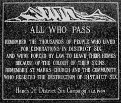 En 1994, un Musée consacré au district Six, situé au centre-ville du Cap, a été inauguré. Il est devenu un lieu de mémoire commémorant la culture et de l'histoire de ce secteur avant les expulsions de ses habitants. Le rez-de-chaussée est notamment recouvert d'une grande carte du District Six. De nombreux panneaux portant le nom des anciennes rues y sont également exposés.