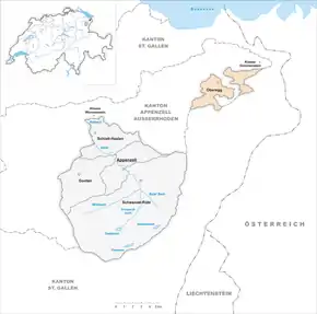 Oberegg n'est pas contigu au reste du canton. Il est constitué de deux parties distinctes, enclavées entre les cantons de Saint-Gall et d'Appenzell Rhodes-Extérieures.