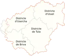 Les districts de la Corrèze en 1790. En rouge, les limites de la Corrèze depuis 1793