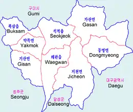 Seokjeok (석적읍, 石積邑)30 48749,66614eup depuis 2006[3]