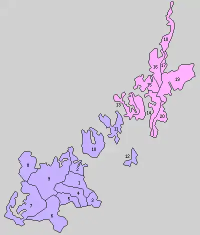 1. Village de Fukue. 2. Village d'Okuura. 3. Village de Sakiyama. 4. Village de Motoyama. 5. Village d'Ohama. 6. Village de Tomie. 7. Village de Tamanoura. 8. Village de Miiraku. 9. Village de Kijuku. 10. Village de Kugashima. 11. Village de Narushima. 12. Village de Kabashima. 13. Village de Hishima. 14. Village de Wakamatsu. 15. Village de Hamanoura. 16. Village d'Aokata. 17. Village d'Uome. 18. Village de Kita Uome. 19. Village d'Arikawa. 20. Village de Narao (aujourd'hui, violet : ville de Goto ; rose : ville de Shinkamigoto).