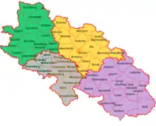 - Bolkenhain-Landeshut, Frankenstein, Glatz (de), Jauer, Münsterberg, Nimptsch, Reichenbach (de), Schweidnitz et Striegau, antérieurement du district de Breslau ;