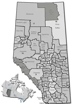 Le Comté de Mackenzie, le comté de Strathcona et la municipalité régionale de Wood Buffalo ne sont pas répertoriés car ils sont incorporés en tant que municipalités spécialisées, et non comme districts municipaux.