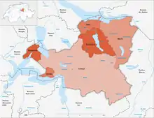 | Nom | Chef-lieu | N° OFS[1] | Communes | Population (décembre 2022)[2] | Superficie (km2) [3] | Densité (hab./km2) |