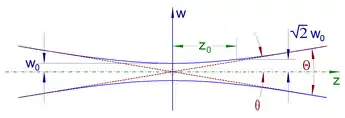 où est la longueur d'onde du laser et le rayon du faisceau à son point le plus étroit, que l'on appelle la « taille de faisceau ». Ce type de divergence de faisceau est observé à partir de cavités laser optimisées. Les informations sur la divergence limitée par la diffraction d'un faisceau cohérent sont intrinsèquement données par l'équation interférométrique à N-fentes[2].