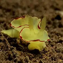 La couleur de l'animal, y compris des rhinophores et des branchies, est d'un jaune citron brillant[2],[1] et un peu plus clair en dessous[5]. Le bord du manteau est parcouru par une bordure rouge sang à carmin très foncé[5] d'une largeur irrégulière[2],[1]. Les rhinophores portent 12 lamelles[5] dont les bords sont blancs opaques[1]. Les branchies, au nombre de six, sont simplement pennées avec peu de pennes[2]. Le bord du manteau est ondulé et ample. Le dos est plat. Le pied fait saillie en arrière et est considérablement élargi à l'avant. Il semble être rainuré mais pas entaillé. Les tentacules sont à peine visibles ressemblant à deux petits boutons émoussés sur le museau[2].