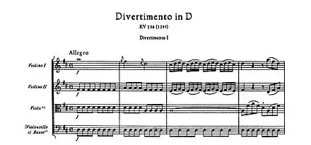 Mozart a composé différents types de divertimentos, prenant même quelquefois la forme de petites symphonies, par exemple les « Symphonies » de Salzbourg KV 136-137-138. D'autres compositeurs, notamment Leopold Mozart, Carl Stamitz, Jommelli, Boccherini (opus 16), Michael et Joseph Haydn[3], ont également composé des divertimentos.