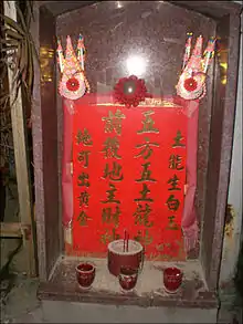 - À gauche : (à Singapour et en Malaisie) "Le Dieu de la Richesse Propriétaire Terrien des Tang d'Outre-Mer" (唐番地主財神) ou (à Hong Kong et dans la diaspora chinoise ailleurs) "Le Dieu de la Richesse Propriétaire Terrien de l'Avant à l'Arrière" (前後地主財神)