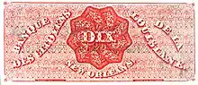 - Un billet de dix dollars imprimé par la Banque des citoyens de la Louisiane[1], avant la guerre civile, qui était marqué dix sur son verso, et fut appelé dès lors « dixes » ou « dixies ». Depuis, la Louisiane, et finalement le Sud en général, devinrent connus comme le pays des dixies ou dixies land. Cette hypothèse est linguistiquement très pertinente dans la mesure où le terme dixie est effectivement très proche du chiffre dix issu de la langue française, à l'époque fortement présente en Louisiane.