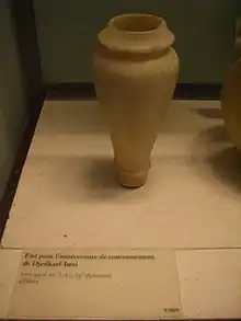 Les contacts commerciaux avec Byblos, sur la côte de l'actuel Liban, sont suggérés par un vaisseau en pierre fragmentaire déterré dans la ville et portant l'inscription Roi de Haute et Basse Égypte, Djedkarê [vivant] à jamais[92],[93]. Une inscription biographique découverte dans la tombe d'Iny, un fonctionnaire de la VIe dynastie, fournit des preuves supplémentaires pour une expédition égyptienne à Byblos sous le règne de Djedkarê[94]. L'inscription d'Iny relate ses voyages pour se procurer du lapis-lazuli et du plomb ou de l'étain[95] pour le pharaon Mérenrê Ier, mais commence par raconter ce qui a dû être des événements similaires se déroulant sous Djedkarê[96].