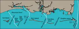L’état du Mississippi sur le golfe du Mexique est bordé d’un chapelet d’îles allongées, parallèle à la côte, dites îles-barrières. Parmi elles, Dog Key Island est représentée sur les cartes à partir de 1847, puis disparait en 1859. Le même phénomène s’est produit depuis à plusieurs reprises[1].
