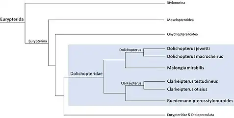 La place des Dolichopteridae au sein des euryptérides a fait l’objet de plusieurs modifications au fil des décennies. D’abord placés dans le sous-ordre Stylonurina[3], la plupart des travaux récents les considèrent comme des euryptérines[1],[8],[9],[10]. Ils font partie des Eurypteroidea, une super-famille paraphylétique[8] incluant entre autres le genre plus connu d’Eurypteridae Eurypterus[1]. Les Dolichopteridae intégraient auparavant Strobilopterus[3], placé désormais avec d’autres euryptérides dans une famille à part, celle des Strobilopteridae[1]. Cette proximité a été retrouvée dans des analyses phylogénétiques en 2013[8], Dolichopteridae et Strobilopteridae étant vraisemblablement des groupes frères.