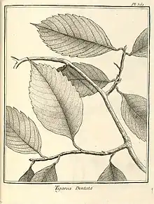 « TIGAREA (dentata) foliis ovato-oblongis, acuminatis, ſubtùs tomentoſis. (Tabula 334. Fig. 1.)Frutex ſarmentoſus, præcedenti quàm ſimilis, ſed differt foliis ovatis, acutis, dentans, ſupernè viridibus glabris, infernè tomentoſis, incanis.