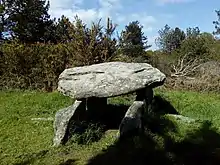 Le dolmen le plus à l'est comprend une table de couverture (1,90 m sur 2,40 m et 0,40 m d'épaisseur). La chambre est délimitée par quatre orthostates dont trois supportent la table de couverture. Selon du Châtellier, le sol de la chambre sous la table était pavé de pierres brutes sur lesquelles s'étendait une couche de sable jaune. Il découvrit, au fond de la chambre, un silex noir taillé d'un seul côté en forme de pointe de lance, sur le côté est de la chambre, un petit vase en terre contenant de petites rondelles en ardoise, très fragiles, et des plaquettes en ardoise couvertes de lignes gravées, et, au nord, un second vase de couleur noire, à fond rond, décoré de petits mamelons coniques près du bord supérieur. La couche archéologique contenait aussi des charbons de bois et quelques fragments osseux[2].