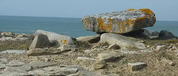 Le dolmen date du Néolithique[4] (probablement du IVe millénaire avant J.-C.). Des fouilles menées par Félix Gaillard en 1883[5] ont mis au jour des poterie de type Conguel[2], des outils en pierre (éclat de silex, haches polies), des parties de parures (dont une épingle en os) et des éléments de squelettes humains appartenant à une cinquantaine d'individus différents[5],[2] sur deux niveaux[2] protégés de l'acidité des sols par le sable[2]. La plupart des crânes étaient séparés des corps et disposés le long de l'un des murs[2]. Une épingle en bronze trouvée sur place témoigne que le site était encore utilisé à la fin du IIIe millénaire av. J.-C.[6]