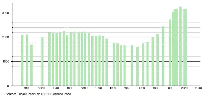 L'évolution du nombre d'habitants est connue à travers les recensements de la population effectués dans la commune depuis 1793. Pour les communes de moins de 10 000 habitants, une enquête de recensement portant sur toute la population est réalisée tous les cinq ans, les populations légales des années intermédiaires étant quant à elles estimées par interpolation ou extrapolation[37]. Pour la commune, le premier recensement exhaustif entrant dans le cadre du nouveau dispositif a été réalisé en 2004[38].