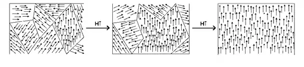 Lors de l'application d'un champ magnétique externe l'énergie Zeeman s'ajoute à l’énergie totale et permet l'augmentation de la taille des domaines comme ci-dessous.