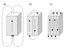 Pour un cube, dans une direction parallèle à un côté . Si l'on fait une approximation pour le schéma a), d'épaisseur L, on trouve une énergie magnétostatique sur le dessus du parallélépipède de :