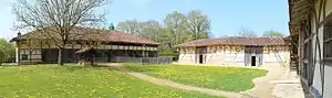 Sur le haut du domaine, les cinq corps de bâtiment sont ordonnés autour d'une cour fermée desservie par un « passou ». La construction de la ferme bressane à cheminée sarrasine, des granges et des remises s'étend de la fin du XVe au XIXe siècle. Ces bâtiments résument l'évolution de la construction rurale traditionnelle en Bresse[8] : toits en tuiles-canal reposant sur une charpente en chêne; ossature à pans de bois de chêne, fondée sur un soubassement en briques appelées carrons, et remplissage en torchis de terre et paille bâti sur un clayonnage d'aulne pour la maison d'habitation ; maçonnerie de pisé sur un soubassement de pierres murueuses ou en briques pour les écuries ou étables. La maison d'habitation abrite une reconstitution des biens du fermier laboureur Benoît Chaffol d'après l'archive notariale d'inventaire après décès de 1784, faisant de la visite de ces bâtiments historiques un des temps forts du parcours.
